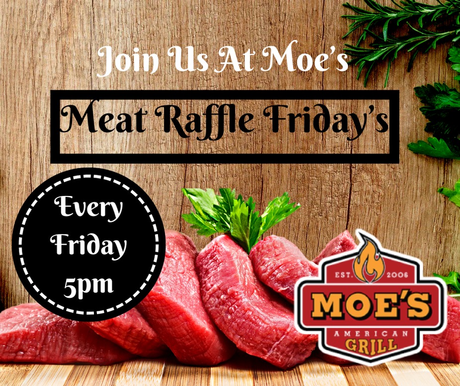 Join us every Friday at 5 PM for the Meat Raffle at Moe’s! Grab a drink, enjoy the vibe, and take your shot at scoring premium cuts to take home.